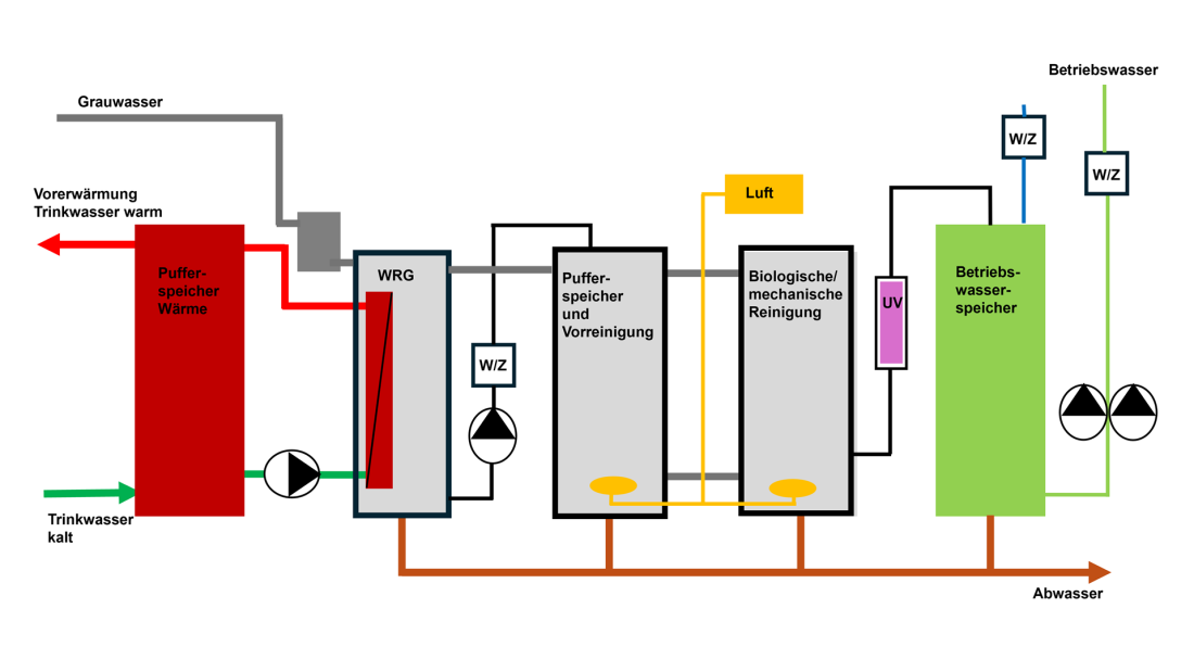 Grauwassernutzung mit Wärmerückgewinnung – clever sparen und Ressourcen schonen Grauwasser fällt täglich in jedem Haushalt an. Anstatt dieses nur gering verschmutzte Abwasser ungenutzt in die Kanalisation abzuführen, kann es über eine moderne Grauwassernutzungsanlage aufbereitet und sinnvoll weiterverwendet werden. Aufbereitung des Grauwassers: Das Wasser wird gefiltert und hygienisch aufbereitet, sodass es beispielsweise für die Toilettenspülung oder die Gartenbewässerung wieder nutzbar ist, Wärmerückgewinnung:Bevor das Wasser die Anlage gelangt, wird die enthaltene Restwärme entzogen und zur Vorerwärmung von Trinkwasser genutzt. Dadurch sinkt der Energiebedarf für die Warmwasserbereitung deutlich. Vorteile auf einen Blick: Reduzierung des Trinkwasserverbrauchs durch Wiederverwendung von Grauwasser. Einsparung von Heizenergie durch integrierte Wärmerückgewinnung.