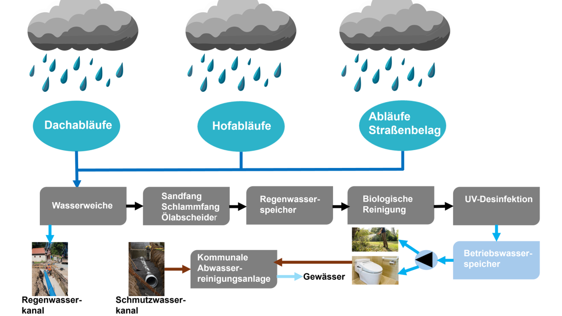 Im dargestellten Schema wird das Auffangen von Niederschlag von Dachflächen, Hofflächen oder befestigten Wegen dargestellt. Nach der Aufbereitung steht das Wasser zur Verfügung und kann je nach Bedarf vielseitig eingesetzt werden, zum Beispiel für: