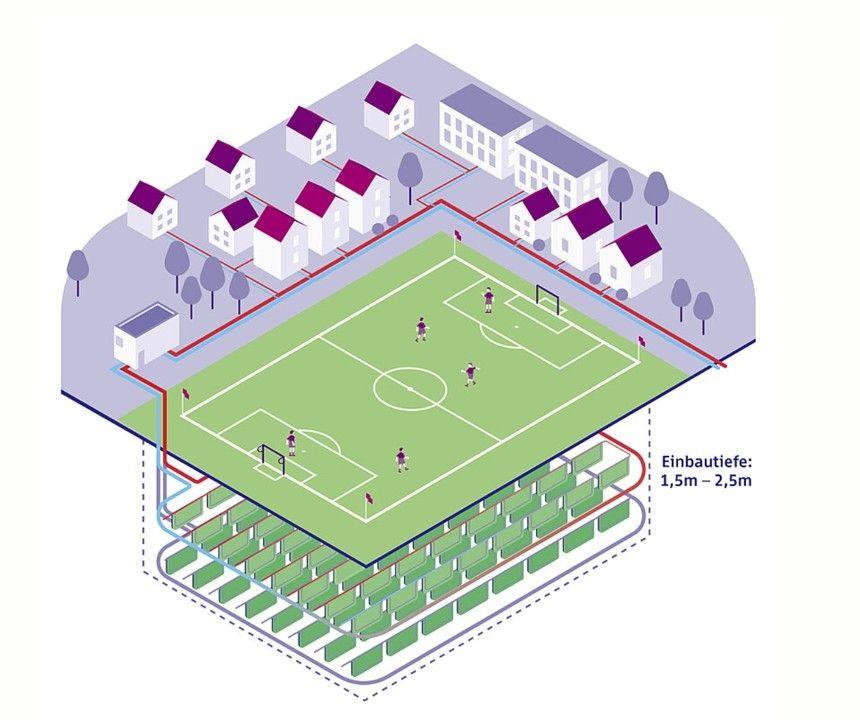 In 1,5 bis etwa 2,5 m Tiefe werden spezielle Erdkollektoren flächig unter dem Sportplatz verlegt, meist in Reihen bzw. in Etagen.