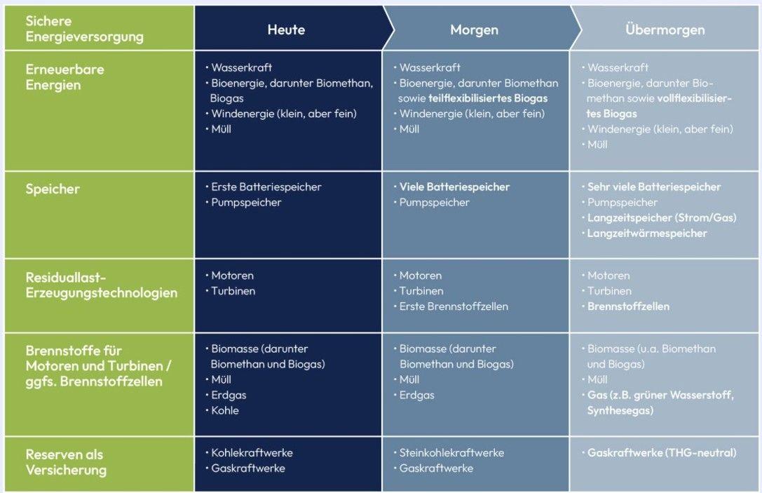 Die Tabelle zeigt auf, wie der Pfad weg von Kohle und Erdgas hin zu Speichern und klimaneutralen Gasen versorgungssicher aussehen kann. Die Residuallast, wird in dem Fall mit den unter dem Begriff Übermorgen genannten Technologien abgedeckt.